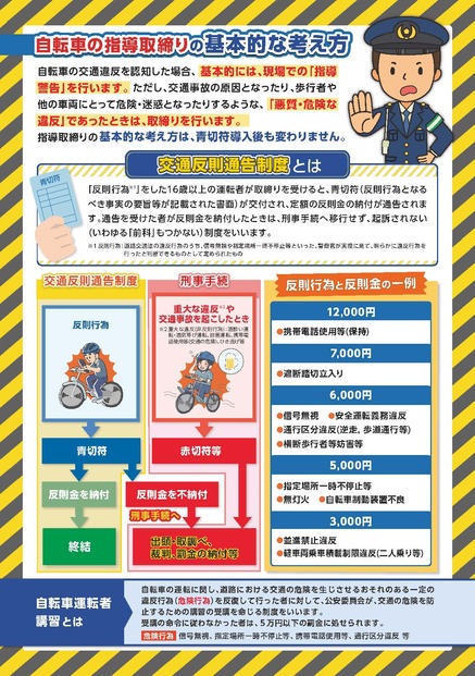 令和8年4月1日から改正道路交通法が施行され、自転車の一定の違反に交通反則通行制度(青切符)が適用されることになりました。