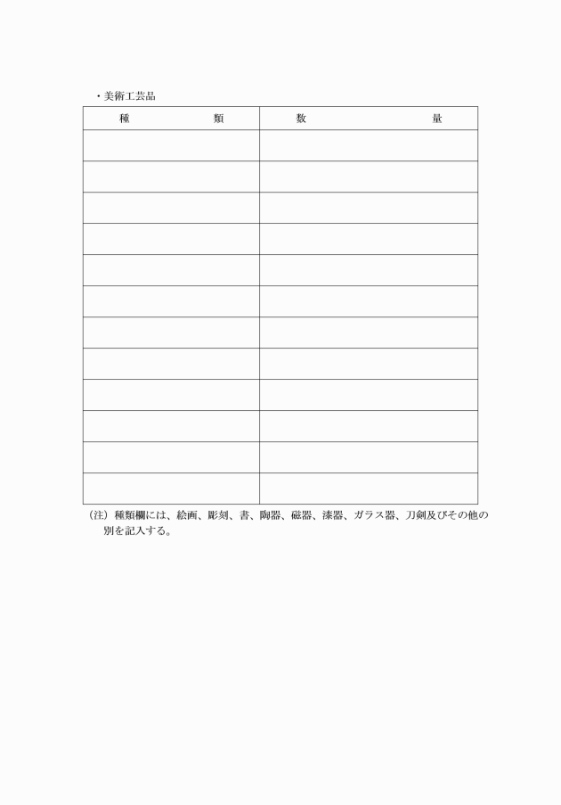 5 条例第2条第1項第6号の美術工芸品の種類は、絵画、彫刻、書、陶器、磁器、漆器、ガラス器、刀剣及びその他とする。