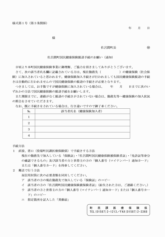 第3条 町長は、推定適用除外世帯の世帯主に対し、法第9条第1項に規定する資格喪失の届出を勧奨するため、郵便法(昭和22年法律第165号)第45条に規定する書留郵便により、佐呂間町国民健康保険脱退手続通知(様式第1号。以下「脱退手続通知」という。)を通知するものとする。
