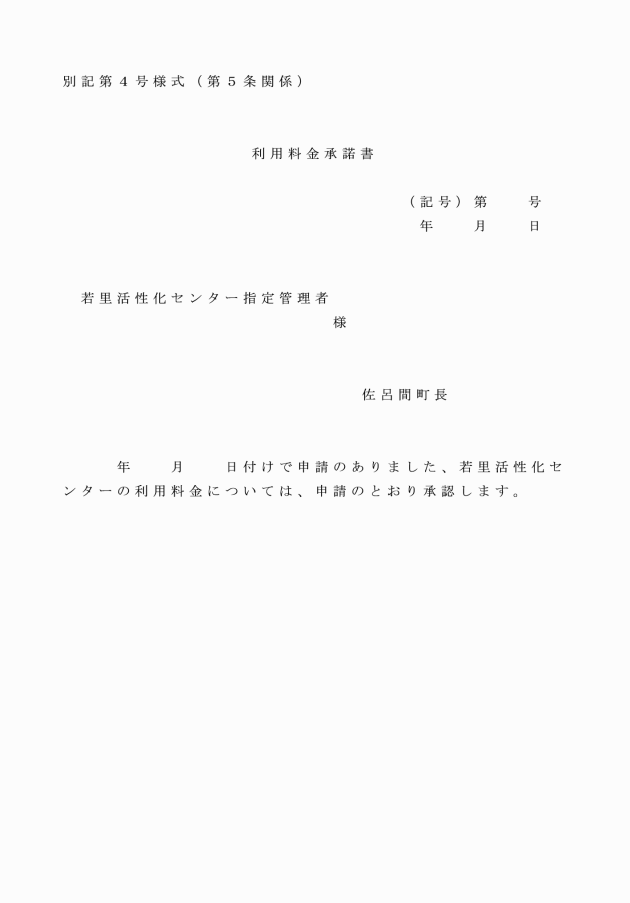 第5条 条例第13条第3項の規定により利用料金の額について町長の承認を受けようとするときは、利用料金承認申請書(別記第3号様式)により町長に申請しなければならない。これを変更しようとするときも同様とする。
