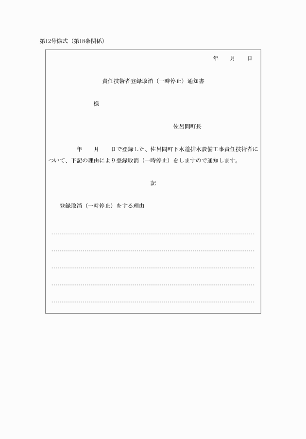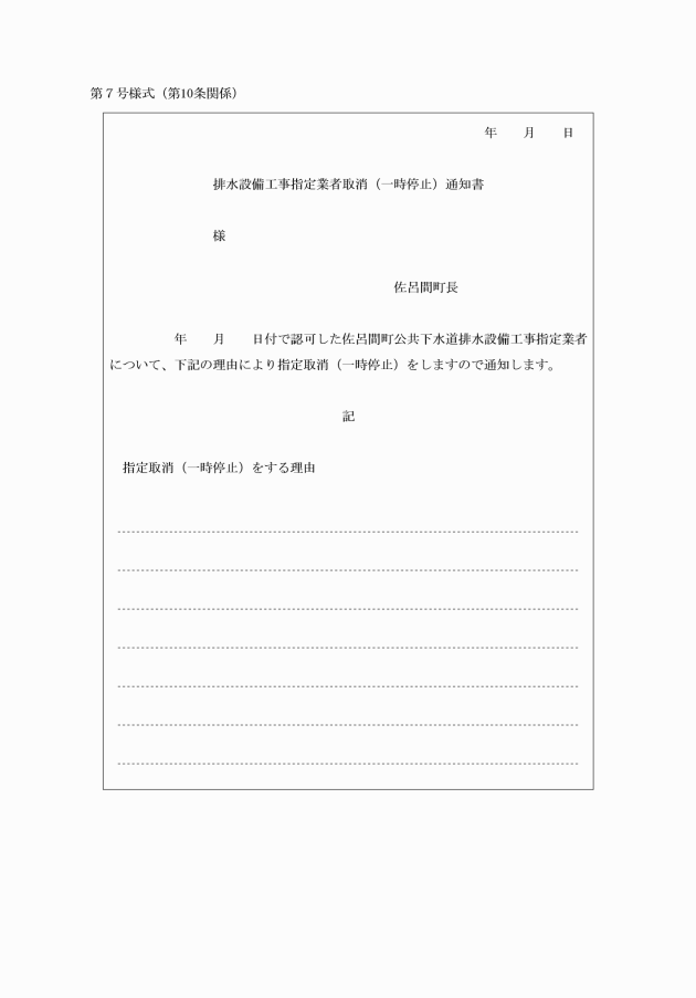 第8条 指定業者が、指定の有効期間満了に際し、継続して指定を受けようとするときは、期間満了30日前までに排水設備工事指定業者継続申請書(別記第5号様式)を町長に提出しなければならない。