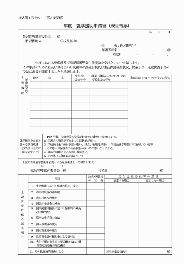 第3条 就学援助を受けようとする者は、毎年度、就学援助申請書(兼世帯票)(様式第1号その1)に必要な書類を添付し、学校長を経由して教育委員会に申請しなければならない。ただし、生活保護法第13条に規定する教育扶助を現に受けている保護者は申請を必要としない。
