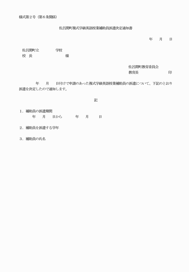 第6条 学校長は補助員の派遣を受けようとするときは、佐呂間町複式学級英語授業補助員派遣申請書(様式第1号)により教育委員会に申請するものとする。